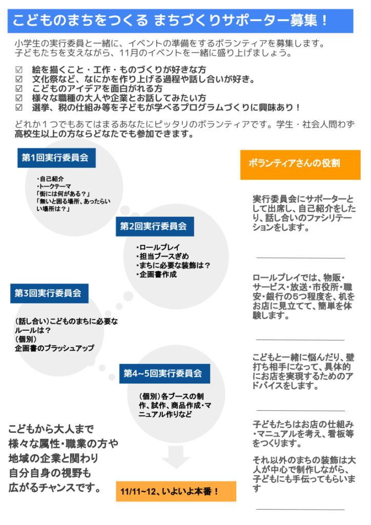【内容】「こどものまち」イベントの企画、運営、装飾作成、小学生の会議運営サポート★中高生の方は「こどものまち」の仕組みやルールを決める議論に参加します。イベントづくりを学んだり、社会のしくみを楽しみながら考える経験が出来ます。事前の知識は不要ですので、気軽に参加OKです!